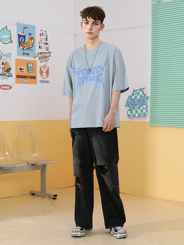 1. Lettering Graffiti Print Loose Shoulder Sleeves Pure Cotton Round Neck T-shirt (C1750J3)