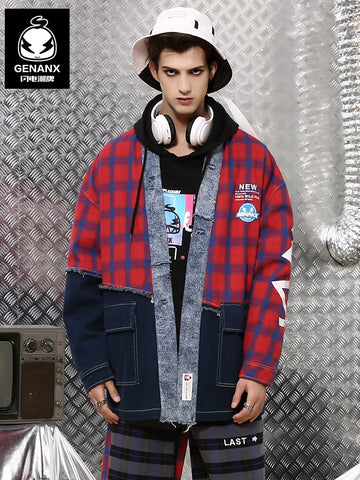 3.Different material color matching printed embroidered Japanese kimono collar denim plaid jacket (JS519)