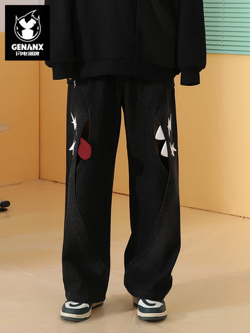 Lightning graffiti print fun decorative patch loose straight leg jeans (P452)