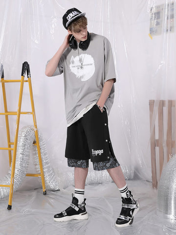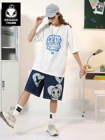 - Love Graffiti Lightning Lord Printed Loose Straight Quarter Denim Shorts (SP413)