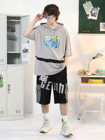 - Workwear style contrasting color patchwork letter printed elastic rope denim shorts (SP423)