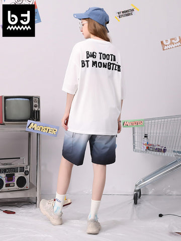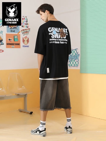 Eg: Little Bear Letter Printed Label Round Neck Drop Shoulder Sleeves Pure Cotton Solid Color T-shirt (C1655)