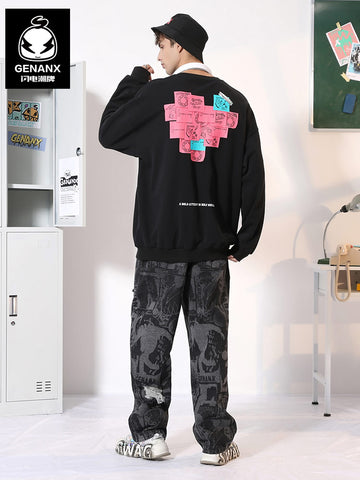 Lightning Lord Full Print Graffiti with Broken Holes, Straight Barrel Black Grey Jeans (P363)